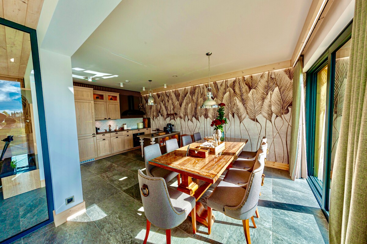 Situado en la ladera sur, en medio de un bosque privado con unas vistas increíbles y lejos de otros edificios, ofrece la oportunidad de relajarse y desconectar de la vida cotidiana. La terraza de dos niveles con chimenea y jacuzzi, el amplio salón, el comedor y el gran jardín y bosque detrás de la casa permiten relajarse completamente incluso con un grupo grande de personas. El amplio aparcamiento para 8 coches ofrece libertad de acceso individual para cada uno de los participantes. Los restaurantes locales ofrecen una amplia selección de platos con entrega a domicilio.