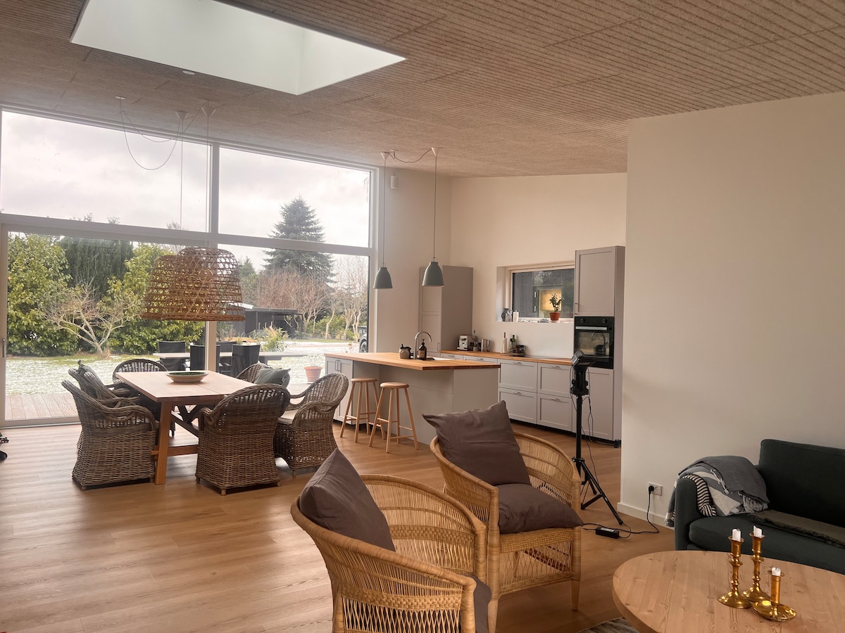 Disfruta de la hermosa puesta de sol, buen senderismo y ciclismo, y de la oportunidad para la pesca y la rica avifauna. Bonita cocina pequeña, que está abierta a la sala de estar. Baño con ducha, lavabo, inodoro y calefacción por suelo radiante. Acogedora sala de estar con acceso a la encantadora terraza de madera, que está protegida. El primer piso se utiliza con 2 habitaciones. Hay 2 encantadoras terrazas de madera, una orientada al este y otra orientada al oeste, así como un balcón que tiene magníficas vistas tanto desde la terraza como desde el balcón.