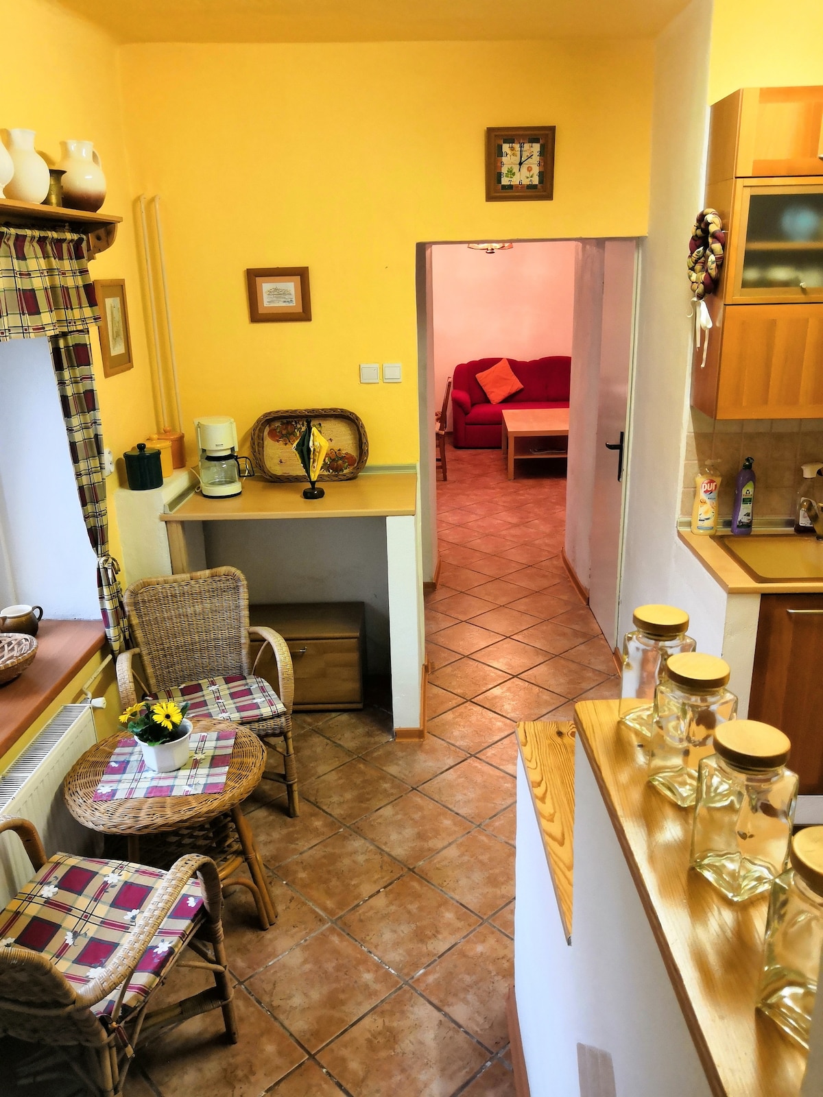 Le ofrecemos una cabaña única original del siglo XVIII con estufa de azulejos funcional, totalmente renovada y equipada, ideal para relajarse y alejarse del ajetreo y el bullicio de la vida moderna. También hay una zona de estar al aire libre con parrilla y sombrilla, equipamiento deportivo para hacer ejercicio, yoga, bádminton, fútbol y frisbee. La casa se encuentra en un pintoresco pueblo de la región de Moravia del Sur, famosa por su vino, naturaleza y monumentos históricos. Durante esta estancia única y tranquila podrá relajarse perfectamente.