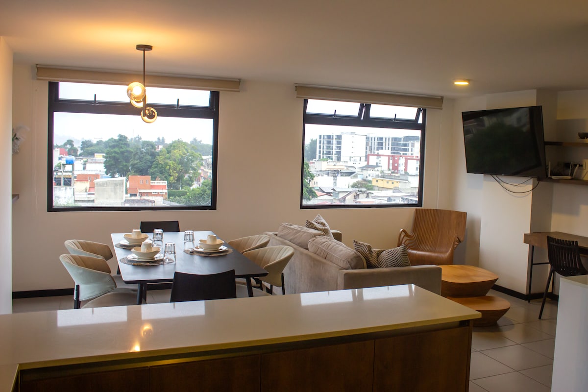 Disfruta de este encantador apartamento pequeño tipo estudio con aire acondicionado portatil de ventana y vistas impresionantes al volcán de Agua desde el balcón. Ubicado estratégicamente en el corazón del distrito comercial y empresarial de Guatemala, a solo 15 minutos del aeropuerto. Este apartamento te ofrece una experiencia única, rodeado de una amplia variedad de restaurantes, bares y centros comerciales para que disfrutes al máximo tu estadía.