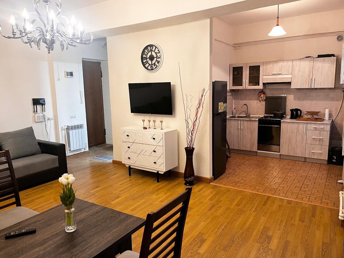 Despiértate con una luz suave y una vista impresionante del monte Ararat. Este luminoso y acogedor apartamento se encuentra a solo unos minutos a pie de la Plaza de la República, cerca de todo, pero tranquilamente escondido. Con grandes ventanales, un cálido diseño minimalista y detalles bien pensados, es el lugar perfecto para relajarse, crear o explorar la ciudad. Ya sea que estés aquí por trabajo o por maravilla, este espacio te da la bienvenida con calma y encanto.