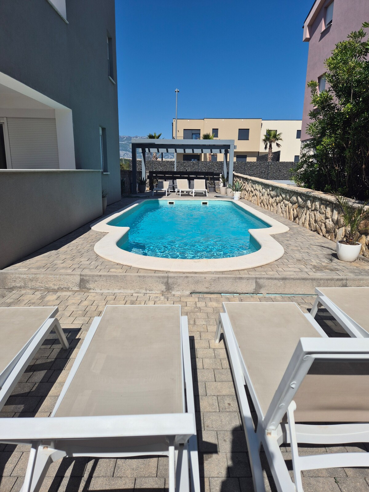 Moderna villa de lujo con piscina y vistas al mar. La villa tiene 5 modernos apartamentos amueblados para 6 personas con una amplia terraza y hermosas vistas al mar. El apartamento cuenta con wifi gratuito, aire acondicionado y lugar de estacionamiento. En el jardín hay una bonita piscina (compartida con otros huéspedes ) donde los huéspedes pueden relajarse tranquilamente durante el día. La villa se encuentra a solo unos minutos a pie de la playa y no muy lejos del centro de la ciudad. La tienda de comestibles y la parada de autobús con líneas directas a la playa de Zrce están junto a la villa.